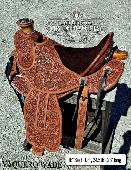 The VAQUERO WADE for a Legs under Centered ride is on a unique TREE. Brown's Black Mesa Saddles have a narrow waist seat, so you can ride all day in comfort. With extra TWIST in the bars the seat has a steeper hourglass shape in the front half where the bars are steeper in angle. As the bar shape is turned out at the top front "GULLET" they become narrower at the bottom bar foot in front. This is what holds the saddle up in front. Contact is primarily at the bottom 1/3rd of the bar. NO-PINCH TWIST means the tree doesn’t pinch withers with a wider gullet. It is supported on the upper rib cage outside the withers by the curved bar foot on each side. This basic geometry is used in all my trees, it lets me send you a saddle without playing “SADDLE-FITTING GAMES”. Only the length is a concern to be sure the saddle is not too long for your horse’s back. A couple of photos of your horse from the side with NO SADDLE, then one with the current saddle and no pad. When I know that saddle length it tells me the saddle length your horse needs. Regards, Len Brown (See Our No Loss Purchase Plan & Cinch Warranty Below.)